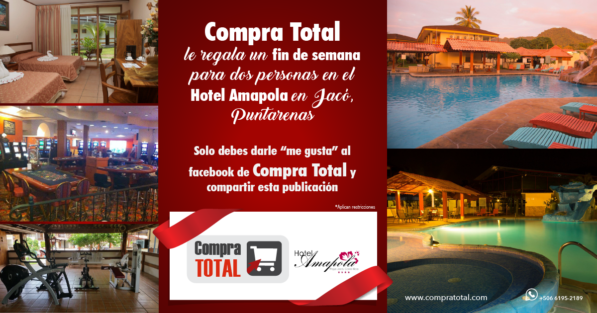 REQUISITOS Y CONDICIONES DE LA PROMOCION DENOMINADA: “SORTEO, COMPRA TOTAL TE REGALA UN FIN DE SEMANA EN HOTEL AMAPOLA” En acatamiento de lo dispuesto en la Ley de Promoción de la Competencia y Defensa Efectiva del Consumidor y su Reglamento, Ley número siete mil cuatrocientos setenta y dos, el Código de Comercio de la República de Costa Rica, y en el resto del ordenamiento jurídico, se establecen los lineamientos para el concurso denominado “SORTEO, COMPRA TOTAL TE REGALA UN FIN DE SEMANA EN HOTEL AMAPOLA”. Para todos los efectos, las partes se atenderán a lo dispuesto en las citadas Leyes...
